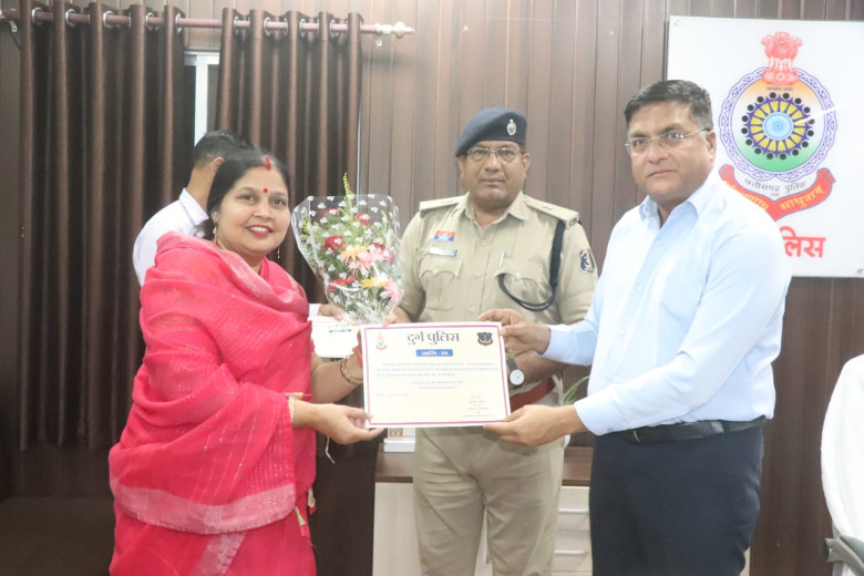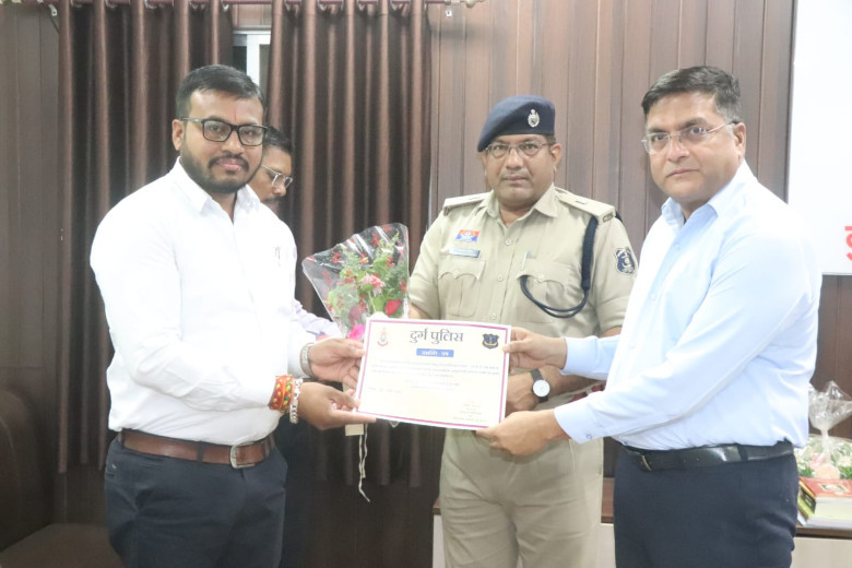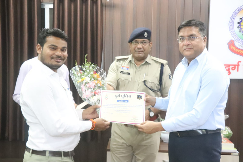 *उक्त सराहनीय कार्य के लिए योगेश निक्की भाले, निशा सोनी, केवल देवांगन, जितेंद्र निर्मलकर, चंद्र प्रकाश देवांगन को वरिष्ठ पुलिस अधीक्षक दुर्ग द्वारा प्रशस्ति पत्र एवं पुष्पगुच्छ देकर सम्मानित किया गया।*