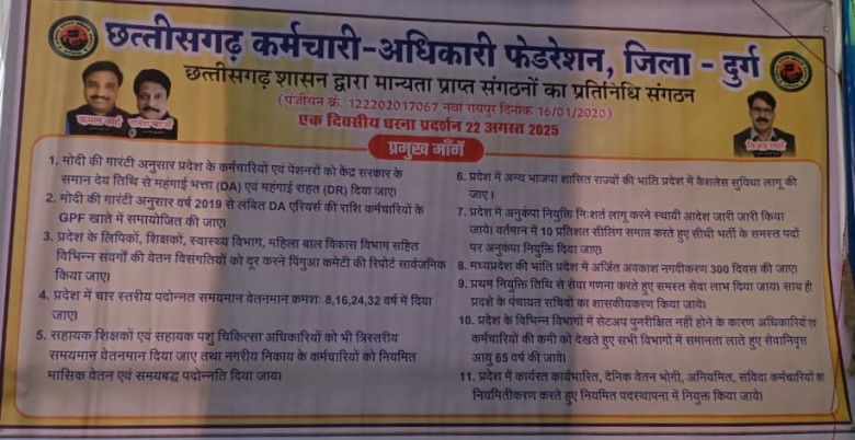 बता दें कि गुरुवार को छत्तीसगढ़ कर्मचारी अधिकारी फेडरेशन के अध्यक्ष कमल वर्मा ने वीडियो जारी कर आज से शुरू होने वाले बेमुद्दत आंदोलन के बारे में जानकारी देते हुए कर्मचारियों से आंदोलन में शामिल होने की अपील की थी। कर्मचारी संगठन के पदाधिकारियों का दावा है कि रायपुर में आज से शुरू हुए आंदोलन में प्रदेशभर के कर्मचारियों की एकजुटता दिखाई दे रही है। कमल वर्मा ने बताया कि फेडरेशन के आह्वान पर 22 अगस्त से काम बंद, कलम बंद आंदोलन की शुरूआत हो रही है। हड़ताल का सरकार की तरफ से रिस्पांस ना मिलने की स्थिति में फेडरेशन 30 अक्टूबर 2025 से अनिश्चितकालीन हड़ताल की घोषणा को लेकर भी अपने विकल्प खुले रखा है।