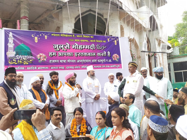 दुर्ग : जश्ने ईद मिलादुन्नबी के 1500 वे साल मुबारक मौके पर आज हजरत सैय्यद बाबा अब्दुल रहमान शाह काबुली रहमतुल्लाह अलैह इन्तेजामिया कमेटी दुर्ग एवं सालाना उर्स पाक कमेटी के जानिब से ईद मिलादुन्नबी के मौके पर जुलुसे मोहम्मदी का जोरदार इस्तकबाल किया गया और तबरूक वितरण किया गया साथ ही दरगाह के आस्ताने मे परचम कुशाई कि गई जहाँ कार्यक्रम मे किछौछा शरीफ से तशरीफ़ लाये हजरत अहमद अशरफ अशरिफुल जिलानी साहब कि जेरे सरपरस्ती मे दुर्ग शहर सहित देश,प्रदेश मे अमन और शांति के लिये दुआ मांगी गई इस मुबारक मौके पर दुर्ग जामा मस्जिद के साथ शहर के तमाम मस्जिदों के ईमामो ख़तिब, एवं दुर्ग नगर निगम कि प्रथम नागरिक श्रीमती अल्का बाघमार, दरगाह हज़रत बाबा अब्दुल रहमान शाह काबुली दरगाह के खादिम जनाब अनवर शाह (अन्नू ) इन्तेजामिया कमेटी के अध्यक्ष जनाब सैय्यद रज्जब अली, सालाना उर्स पाक कमेटी के अध्यक्ष प्रकाश देशलाहरा जी, और रऊफ कुरैशी, कमेटी के मेंबरान यूनुस पटेल साहब, हाज़ी इस्माईल चौहान,अजहर जमील, शेख असलम, मो शरीफ खान, सैय्यद मासूब अली, हैदर अली, साजिद महिंद्रा, अबरार पंवार, अहमद खान (मुन्ना) अमजद अली,अनीस रज़ा, शाबाना निशा रानी,सैय्यद आशिफ़, इसराईल बेग (शाद भाई ) अफसर कुरैशी, मारुफ आलम,सहित मुस्लिम समुदाय के लोग भारी संख्या मे मौजूद रहे...