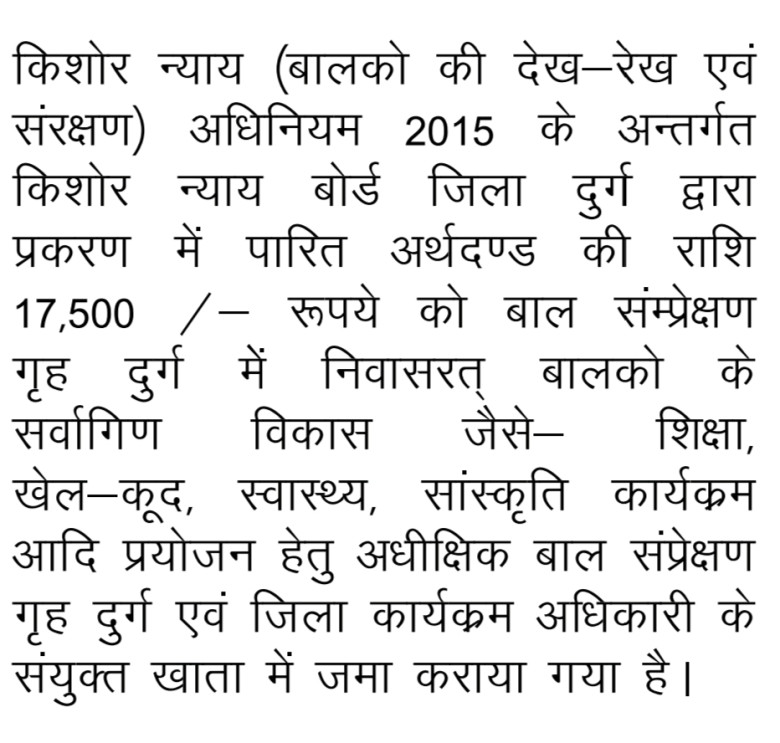 किशोर न्याय (बालको की देख-रेख एवं संरक्षण) अधिनियम 2015 के अन्तर्गत किशोर न्याय बोर्ड जिला दुर्ग द्वारा प्रकरण में पारित अर्थदण्ड की राशि 17,500/- रूपये को बाल संम्प्रेक्षण गृह दुर्ग में निवासरत् बालको के सर्वागिण विकास जैसे- शिक्षा, खेल-कूद, स्वास्थ्य, सांस्कृति कार्यकम आदि प्रयोजन हेतु अधीक्षिक बाल संप्रेक्षण गृह दुर्ग एवं जिला कार्यक्रम अधिकारी के संयुक्त खाता में जमा कराया गया है।