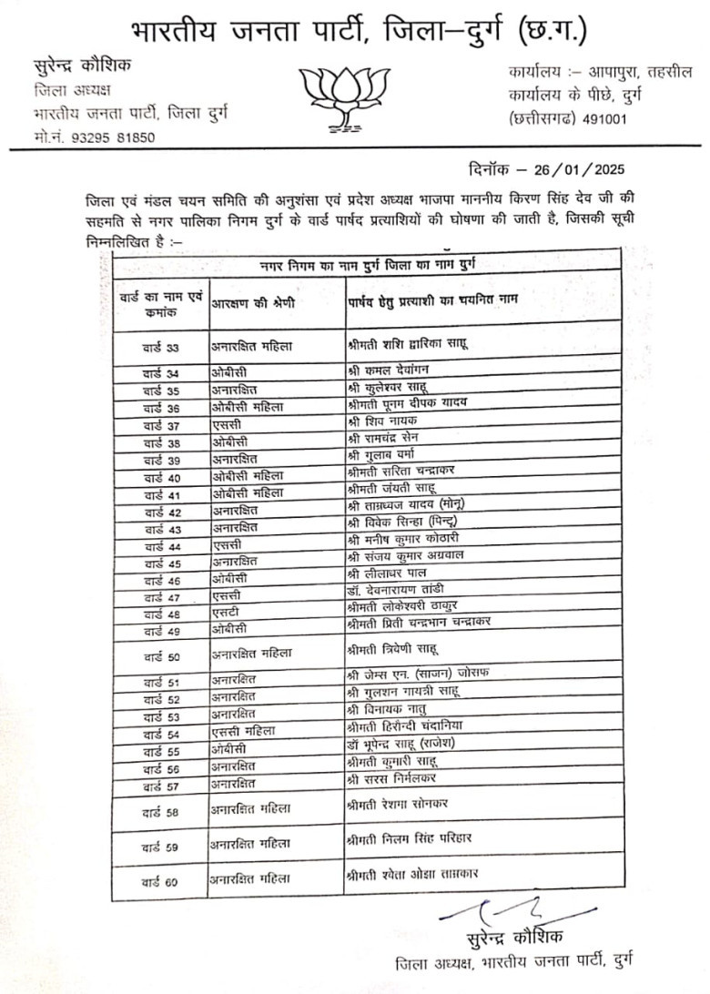 दुर्ग : जिला एवं मंडल चयन समिति की अनुशंसा एवं प्रदेश अध्यक्ष भाजपा माननीय किरण सिहं देव की सहमति से नगर पालिका निगम दुर्ग के वार्ड पार्षद प्रत्याशियों की घोषणा की जा चुकी है|