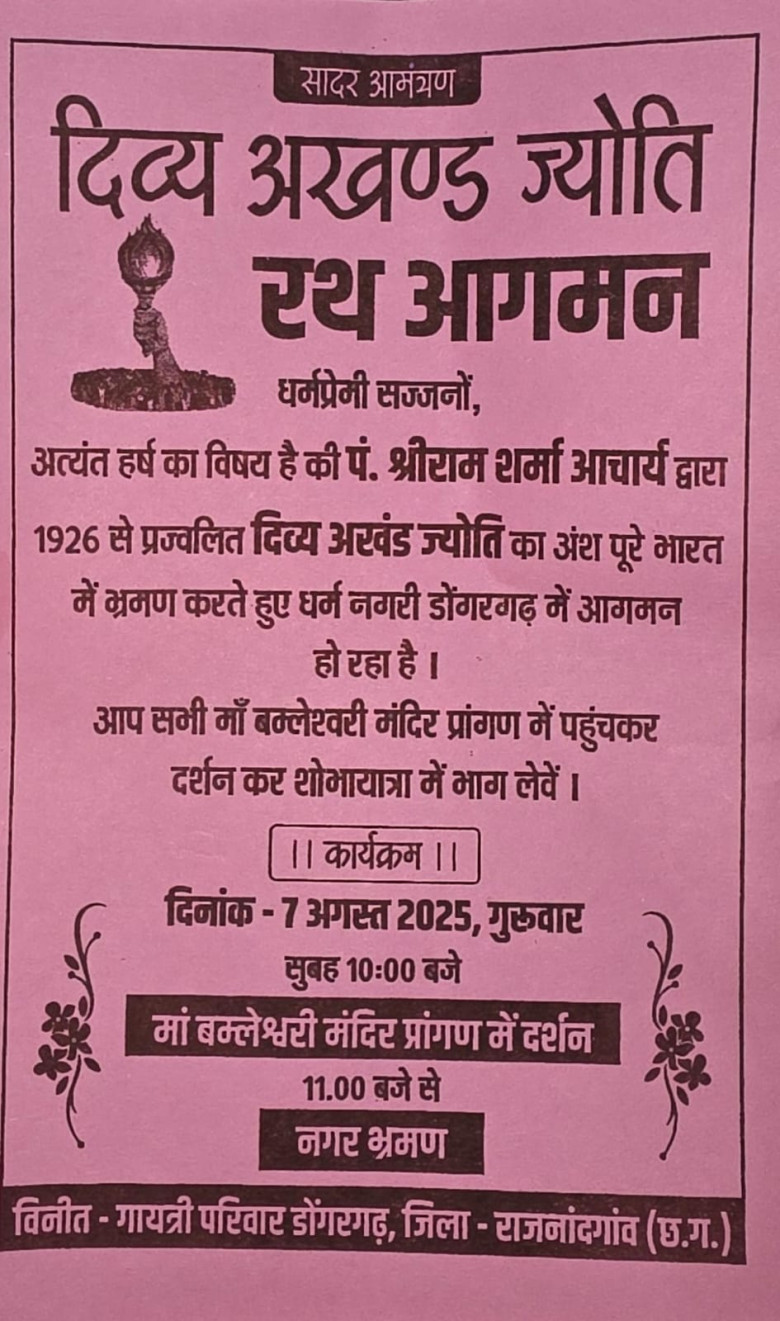 भारत के महान युगदृष्टा, हरिद्वार में शांतिकुंज आश्रम एवं गायत्री परिवार के संस्थापक पंडित श्रीराम शर्मा आचार्य द्वारा 1926 में प्रज्ज्वलित अखंड ज्योति के शताब्दी वर्ष पूर्ण होने के उपलक्ष्य में विश्व शांति की भावना के साथ अखंड ज्योति रथ संपूर्ण देश भर में भ्रमण करते हुए धर्मनगरी डोंगरगढ़ में कल 7 अगस्त को आगमन हो रहा है। अखंड ज्योति रथ मां बम्लेश्वरी मंदिर से प्रारंभ होकर शोभायात्रा के रूप में पूरे नगर का भ्रमण करेगा। उक्त जानकारी देते हुए गायत्री परिवार के सदस्य सतीश साहू एवं साथियों ने नगरवासियों से अधिक से अधिक संख्या में सम्मिलित होकर दर्शन लाभ लेने की अपील की है।