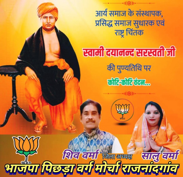 राजनांदगांव। जिला भाजपा पिछड़ा वर्ग मोर्चा के जिला अध्यक्ष पार्षद दल के प्रवक्ता शिव वर्मा ने स्वामी दयानंद सरस्वती की पुण्यतिथि पर उन्हें शत-शत नमन करते हुए कहा कि उनके कुछ बात इस प्रकार है स्वामी दयानंद के लिए प्रमुख लोगों के कुछ उद्गार लोकमान्य तिलक- स्वराज्य के प्रथम संदेशवाहक स्वामी दयानंद सुभाषचंद्र बोस - आधुनिक भारत का निर्माता दयानंद डॉ. भगवानदास- स्वामी दयानन्द हिन्दू पुनर्जागरण के मुख्य निर्माता एनी बेसेन्ट- दयानन्द पहले व्यक्ति थे, जिन्होंने भारत भारतीयों के लिए की घोषणा की सरदार पटेल- भारत की स्वतंत्रता की नींव स्वामी दयानंद ने डाली स्वामी दयानंद के उल्लेखनीय कार्य आर्य समाज के संस्थापक तथा समाज-सुधारक स्वामी जी ने धर्म परिवर्तन कर चुके लोगों को पुन: हिन्दू बनने की प्रेरणा देकर शुद्धि आंदोलन चलाया स्वामी दयानंद ने हिन्दी भाषा में सत्यार्थ प्रकाश पुस्तक तथा अनेक वेदभाष्यों की रचना की सन् 1886 में लाहौर में स्वामी दयानंद के अनुयायी लाला हंसराज ने दयानंद एंग्लो वैदिक कॉलेज की स्थापना की थी सन् 1901 में स्वामी श्रद्धानंद ने कांगड़ी में गुरुकुल विद्यालय की स्थापना की।