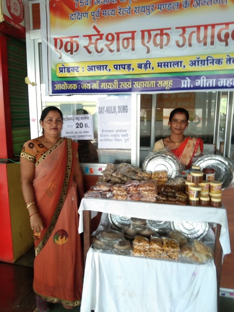 नगर पालिक निगम।दीनदयाल अंत्योदय योजना- राष्ट्रीय शहरी आजीविका मिशन द्वारा गठन किए गए स्व सहायता समूह को रोजगार/ स्वरोजगार हेतु लगातार प्रेरित किया जा रहा है जिसे स्व सहायता समूह की महिलाओं को रोजगार मूलक गतिविधियों से जोड़कर उनकी आजीविका में वृद्धि की जा सके इसी के तहत दुर्ग रेलवे स्टेशन में मां गायत्री स्व सहायता समूह की महिलाओं द्वारा विभिन्न प्रकार के सूखा नाश्ता तथा मरोदा रेलवे स्टेशन में जय माता रानी स्व सहायता समूह उतई द्वारा विभिन्न खाद्य सामग्री एवं घरेलू उपयोग की सामग्री आदि का स्टाल लगाकर बिक्री किया जा रहा है स्टॉल लगाने वाली महिलाओं को यात्रियों तथा आम नागरिकों का अच्छा प्रतिसाद मिल रहा है महिलाएं प्रतिदिन औसतन 1500 से 2000 तक की बिक्री कर रही हैं।