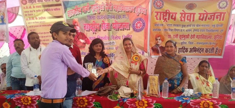 राजनांदगांव। छुरिया विकासखंड के ग्राम पंचायत बेलरगोंदी में शासकीय रानी सूर्यमुखी देवी महाविद्यालय छुरिया, की राष्ट्रीय सेवा इकाई द्वारा सात दिवसीय विशेष शिविर का आयोजन 2 दिसंबर से 8 दिसंबर तक ग्राम पंचायत बेलरगोंदी में किया गया। इस अवसर पर कार्यक्रम की समापन दिवस के अवसर पर मुख्य अतिथि श्रीमती गीता घासी साहू अध्यक्ष जिला पंचायत राजनांदगांव थी। मुख्य अतिथि श्रीमती गीता घासी साहू ने स्वामी विवेकानंद जी के तैल चित्र के समक्ष दीप प्रज्वलित कर विधिवत पूजा अर्चना कर कार्यक्रम का शुभारंभ किया। तत्पश्चात श्रीमती गीता घासी साहू को बैच, पुष्पहार, शाल ,मोमेंटो भेंटकर कर सम्मानित किया। और इसी दिन 8 दिसंबर को श्रीमती गीता घासी साहू के जन्मदिन होने के कारण केक काटकर हर्षोल्लास के साथ जन्मदिवस मनाया गया।स्कूली बच्चों , राष्ट्रीय सेवा योजना के समस्त छात्र-छात्राएं एवं समस्त शिक्षक शिक्षिकाएं व पंचायत प्रतिनिधियों एवं ग्रामीणों ने उन्हें जन्मदिन की बहुत-बहुत हार्दिक बधाई एवं शुभकामनाएं प्रेषित किया। सरपंच श्रीमती रमशीला साहू एवं शासकीय रानी सूर्यमुखी देवी महाविद्यालय प्राचार्य सुषमा चौरे नेताम ने अध्यक्ष श्रीमती गीता घासी साहू को गुलदस्ता, मोमेंटो भेंटकर सम्मानित किया। मुख्य अतिथि श्रीमती गीता घासी साहू ने कार्यक्रम को संबोधित करते हुए कहा कि छात्र जीवन में अनुशासन जीवन से एक नई ऊंचाईयां मिलती है। स्वयं सेवकों के द्वारा ग्राम में जागरण रैली, प्रयोजना कार्य ,बौद्धिक परिचर्चा, स्वास्थ्य कार्यक्रम एवं सांस्कृतिक कार्यक्रमों के माध्यम से लोगों में जन जागरूकता की दिशा में प्रयास किया।सात दिवसीय विशेष शिविर के समय स्वयंसेवकों एवं अधिकारियों का व्यवहार मिलनसार एवं प्रशंसनीय रहा ।इसके लिए आप सभी को हार्दिक बधाई एवं शुभकामनाएं प्रेषित किया। जिला पंचायत अध्यक्ष गीता घासी साहू ने मोमेंटो एवं प्रशस्ति पत्र भेंट कर सराहनीय कार्य करने के लिए छात्र दल के नायक एवं उत्कृष्ट कार्य करने वाले छात्र-छात्राओं को सम्मानित किया। इस अवसर पर जिला पंचायत अध्यक्ष श्रीमती गीता घासी साहू ,श्रीमती सुषमा चौरे नेताम प्राचार्य शासकीय रानी सूर्यमुखी देवी महाविद्यालय, घासी राम साहू महामंत्री भाजपा किसान मोर्चा ,डॉ राजेंद्र शर्मा प्रोफेसर ,सरपंच श्रीमती रमशीला साहू ,छन्नू लाल साहू ग्राम पटेल, आलोक मिश्रा समाजसेवी, अनिरुद्ध पटेल आयुर्वेदिक हॉस्पिटल, सुंदर लाल चतुर्वेदी प्राचार्य शासकीय हायर सेकेंडरी स्कूल बेलरगोंदी, भागवत टांडेकर, पुरुषोत्तम मोटघरे ,नरेंद्र चतुर्वेदी, हेमलता पंच, सीमा यादव पंच ,सीमा साहू पंच ,केकई साहू पंच ,तामेश्वरी साहू, अहिल्याबाई साहू, सुनीता बनपेला सहित समस्