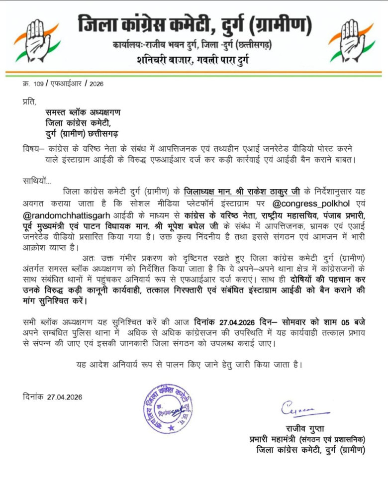 जिला कांग्रेस कमेटी दुर्ग (ग्रामीण) ने जारी पत्र में बताया कि सोशल मीडिया प्लेटफॉर्म इंस्टाग्राम की आईडी **@congress_polkhol** एवं **@randomchhattisgarh** के माध्यम से वरिष्ठ कांग्रेस नेता एवं पूर्व मुख्यमंत्री Bhupesh Baghel के संबंध में आपत्तिजनक AI वीडियो प्रसारित किए गए हैं।