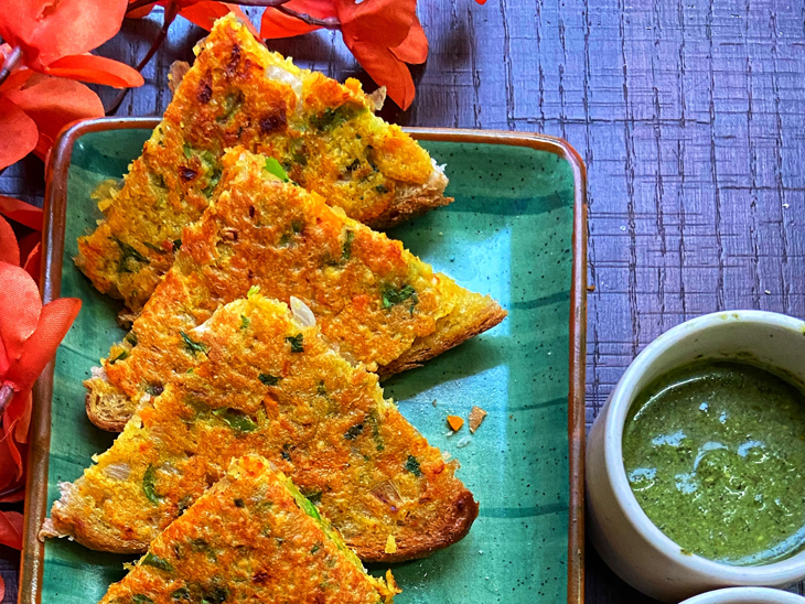 मूंगदाल- 1 कप, हरी मिर्च- 2, हल्दी- 1/2 छोटा चम्मच, काली मिर्च पाउडर- 1/4 छोटा चम्मच, नमक- 1/2 छोटा चम्मच, हींग- 1 चुटकी, प्याज़- 1/2 बारीक कटा, गाजर- 1/2 किसी हुई, शिमला मिर्च- 1/2 बारीक कटी, हरा धनिया- 2 बड़े चम्मच, ब्रेड स्लाइस - 6, मक्खन- सेंकने के लिए।